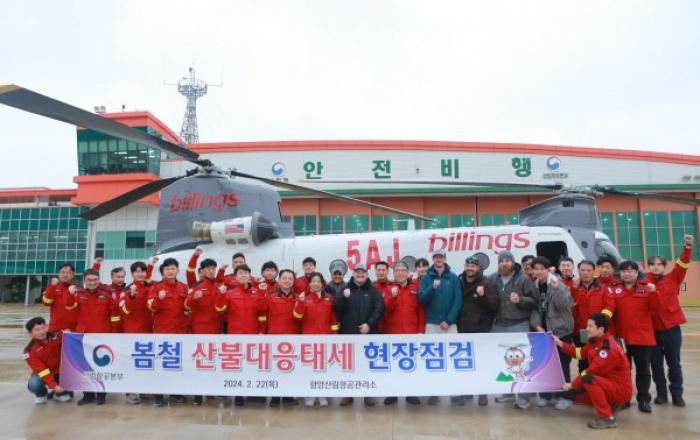 산림청은 22일 함양산림항공관리소를 방문하여 국내·외 산불진화사례와 진화전략을 공유하고 산불진화헬기 출동태세를 점검했다고 밝혔다. 산림청은 2월부터 기존 카모프 헬기 대비 속도는 1.7배 빠르고, 담수량은 3.1배로 시간당 최대 8배의 진