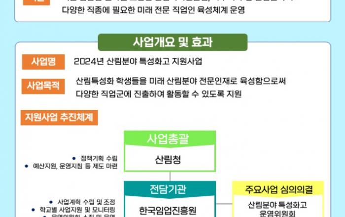 산림청은 23일 대전 산림병해충모니터링센터에서 산림분야 특성화고등학교 운영위원회를 개최하여 총 3개교를 특성화 학교로 선정했다고 밝혔다. 기존에 운영하던 경북 ‘한국산림과학고(’12년~)’와 충북 ‘청주농업고(’15년~)’는 재선정되었으며