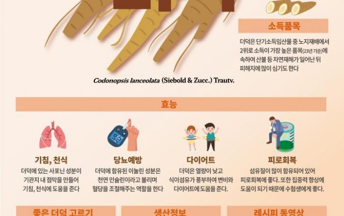 산림청은 6월 이달의 임산물로 산삼에 못지않은 효능을 지닌 ‘더덕’을 선정했다고 17일 밝혔다. 더덕은 도라지과의 여러해살이풀로 독특한 향기를 지닌 뿌리 나물이다. 풍부한 영양소와 높은 효능을 지녀 ‘사삼’이라고도 부르며 뿌리에 울퉁불퉁한 작은