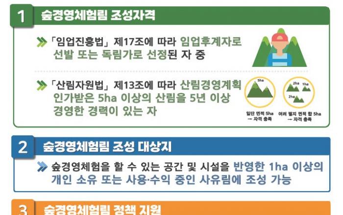 산림청(은 21일부터 22일까지 양일간 전남 보성, 충남 천안 지역을 대상으로 현장을 찾아 숲경영체험림 컨설팅을 실시한다고 밝혔다. ‘숲경영체험림’은 산림문화·휴양에 관한 법률의 개정을 통해 임업인들이 숲경영과 산림휴양서비스를 함께 운영하