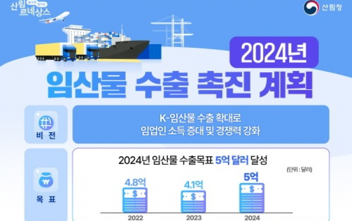 산림청은 올해 물류비 보조 폐지, 위생·검역 등 비관세 장벽 강화 등 수출환경 변화에 대비하여 임산물의 수출경쟁력을 강화할 수 있는 ‘2024년 임산물 수출 촉진계획’을 추진한다고 22일 밝혔다. 지난해 임가소득과 직접적 연계성이 높은 주