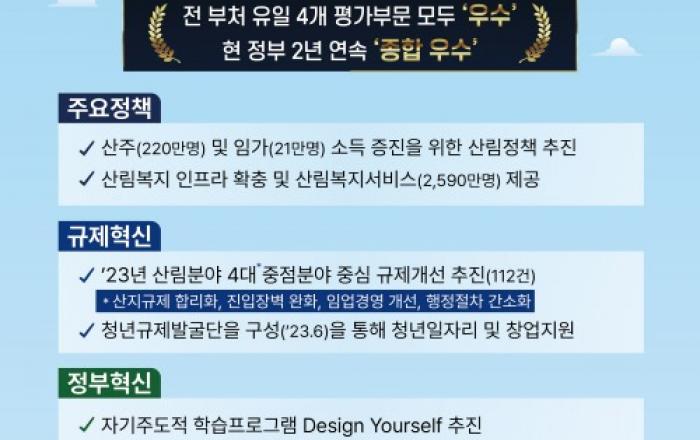 산림청은 45개 중앙행정기관 대상 2023년 정부업무평가에서 기관 종합평가 ‘우수’에 선정되는 영예를 차지했다고 밝혔다. 특히, 전 부처에서 유일하게 주요정책, 규제혁신, 정부혁신, 정책소통 등 4개 평가부문에 대하여 모두 ‘우수’ 등급을