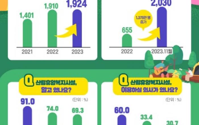 산림청은 2023년도 자연휴양림의 이용자 수* 는 1,924만 명으로, 전년보다 약 14만 명이 증가했다고 밝혔다. 지난해의 경우 코로나19가 해제되면서 해외 방문을 위한 출국인원 수* 가 전년도에 비해 3배 이상 늘어나, 국내관광에 전반적으로 영향을