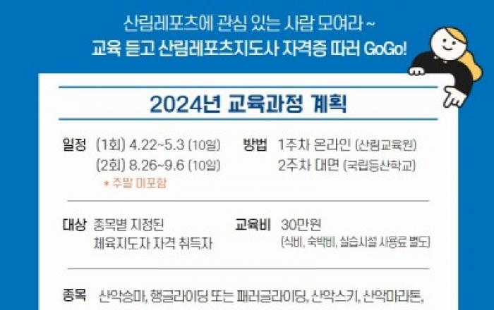 산림청은 23일 산악승마, 산악자전거 등 8개 종목에 대해 지도사 자격을 취득할 수 있는‘산림레포츠지도사 양성과정’교육생을 모집한다고 밝혔다. 산림레포츠지도사는 국민들이 안전하고 편리한 산림레포츠 활동을 할 수 있도록 지도·관리해 주는 전