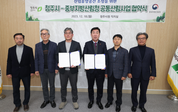 중부지방산림청은 청주시와 12.18.(월) 청주시청 임시청사 직지실에서 국유림을 활용한 산림문화휴양 활성화를 위한 공동산림사업 업무협약을 체결하였다. 이번 협약을 통해 산림청은 잘 가꾼 국유림을 무상으로 제공하고 청주시에서는 청주시민의 산림문화 휴양활동을
