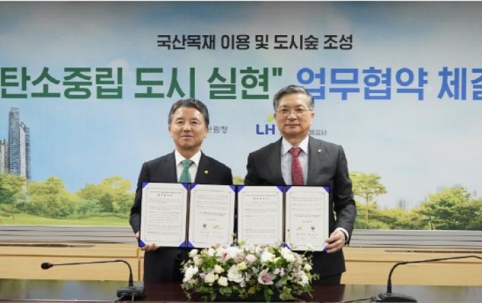 산림청과 한국토지주택공사는 23일 한국토지주택공사(LH) 서울지역본부에서 목재 이용 및 도시숲 조성을 통해 생활 속 탄소중립도시를 실현하기 위한 업무협약(MOU)을 체결하였다. 이번 협약을 통해 양 기관은 공원, 공공건축물 등 한국토지주택