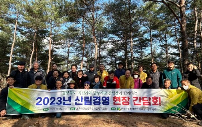 남부지방산림청은 한국산림경영인협회 대구·경북지회와 11월 23일 임업경영 현장(청송군 진보면)에서 “산림경영 현장 간담회”를 개최하였다. 이번 현장 간담회에서는 남부지방산림청과 한국산림경영인협회 부회장 및 대구·경북지회장, 경상북도 독림가 등 임업인이 참석하여
