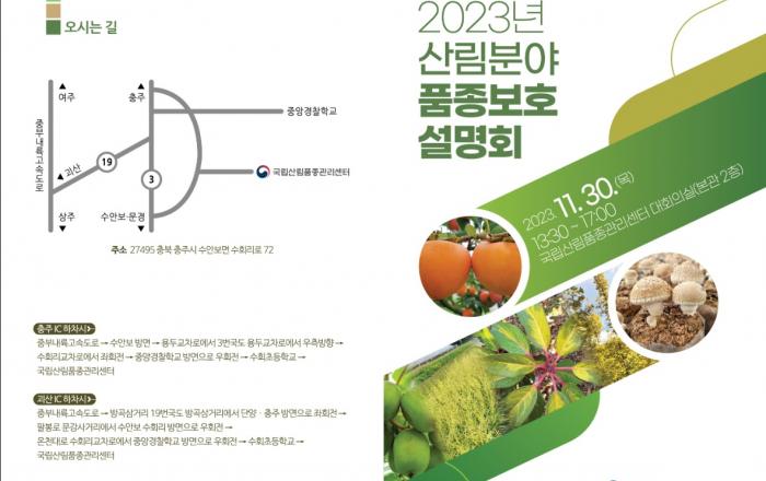 산림청 국립산림품종관리센터는 오는 11월 30일(목) 오후 1시 30분부터 충주시 수안보면 수회리에 위치한 센터 대회의실에서 「2023년 산림분야 품종보호 설명회」를 개최한다고 밝혔다. 이번 설명회는 산림 신품종 육종가 및 산림 종자