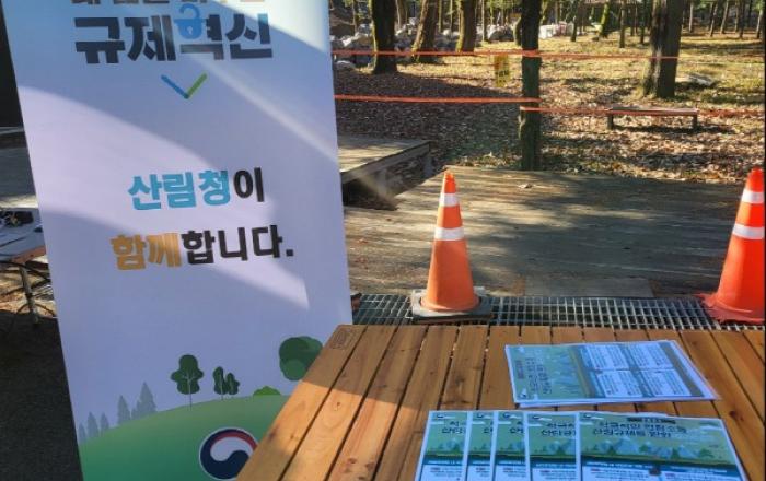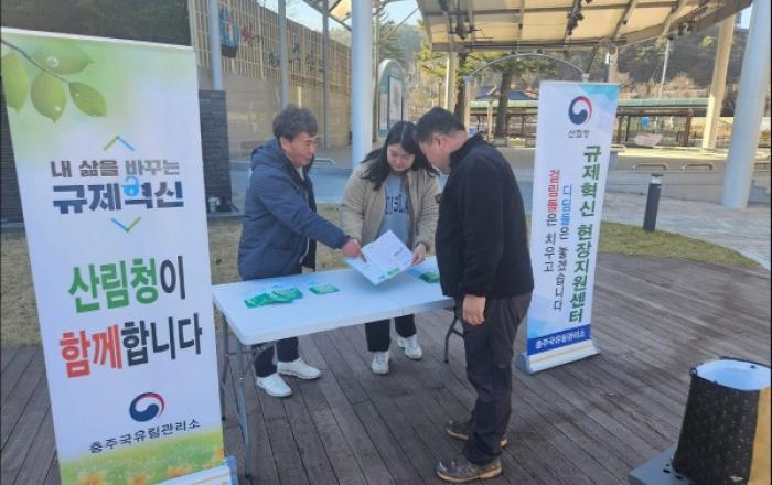 충주국유림관리소는 11월 20일 충주시 수안보면 미륵리 90-1 일원에서 등산객 및 지역 주민을 대상으로 '규제혁신 현장지원신테' 를 운영했다. 산림청은 올해 △사립자연휴양림 내 식당 조성기준 완화, △대체산림자원조성비 분할납무 기준금액 완화, △국유
