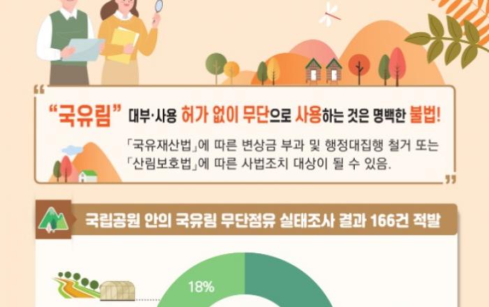 산림청은 지난 6월 12일부터 9월 27일까지 국립공원 내 국유림 무단 점유 일제 조사를 실시한 결과, 166건 351,882㎡의 신규 무단점유지가 확인되었다고 22일 밝혔다. 조사 결과, 적발된 166건 중 농경용이 78건으로 47%,