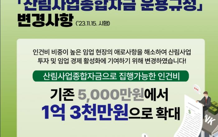 산림청은 산림사업종합자금으로 집행 가능한 인건비 한도 확대 등의 내용을 담은 「산림사업종합자금 운용 규정」이 2023.11.15.일부터 시행된다고 밝혔다. 이번 개정·시행된 「산림사업종합자금 운용규정」의 주요 내용은 △인건비 집행 한도를