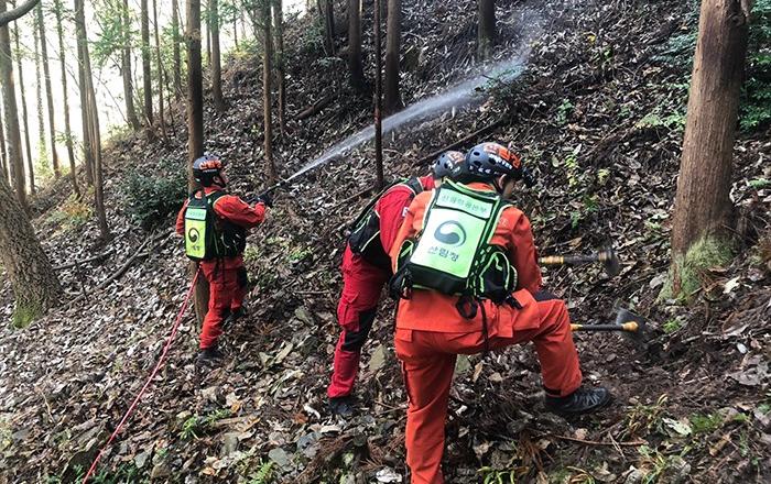 산림항공본부 영암산림항공관리소는 오늘 11월 9일 강진군 서기산에서 중형펌프를 활용한 기계화 산불 진화 훈련을 실시했다. 훈련 내용은 계곡부 중형펌프를 설치 및 가동하여 진화용 호스와 살수건을 이용해 직접 진화하는 방식의 훈련을 실시했다.