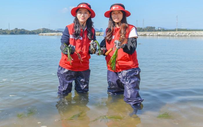 LG화학이 여수 앞바다에 바닷속 탄소 흡수원 ‘잘피’ 5만주를 심고 지속가능한 바다 생태계를 만든다. LG화학은 31일 유관기관과 함께 여수 대경도 바다에 잘피 이식과 해양환경 연구를 시작했다고 밝혔다. 지난 6월 잘피 서식지 복원 및 연구 사업을 진행한