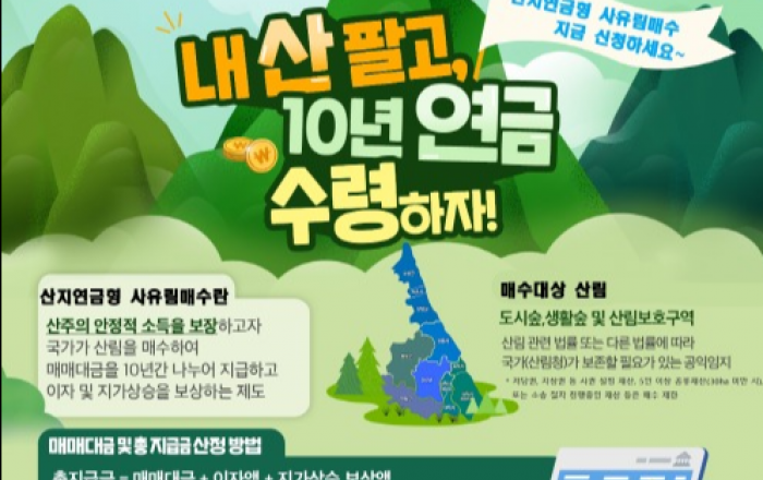 동부지방산림청은 금년도 약 15억원의 예산을 투입하여 146ha의 사유림 매수를 추진하고 있으며, 해당 매수 면적은 약 228개의 축구장 크기에 달한다. 그중「산지연금형 사유림매수」는 2021년부터 산림청에서 새롭게 도입한 제도로, 산림관계 법률에 따라 행위가