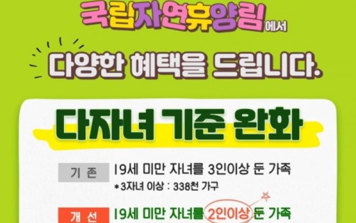 산림청은 6월 11일부터 국립자연휴양림 이용료 감면기준이 3자녀에서 2자녀 가정으로 완화된다고 밝혔다. 기존 국립자연휴양림 이용료 혜택은 19세 미만 자녀를 3인 이상 둔 가정에 적용됐으나 최근 출산인구 감소 및 가족구성원 수 변화 등을 고려해