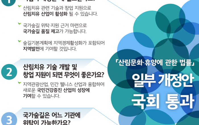 산림청은「산림문화·휴양에 관한 법률」 일부개정안이 10월 6일 국회 본회의를 통과했다고 밝혔다. 개정안의 주요내용은 산림치유 연구개발 보급과 관련 기술의 사업화 촉진을 위한 법률 기반 마련(김홍걸 의원 대표 발의), 국가숲길 운영·관