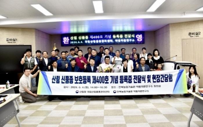 산림청 국립산림품종관리센터는 산림분야 품종보호등록 제400호를 기념하여 등록증 전달식 및 개인·지자체 육종가 현장 간담회를 4일 전북농업기술원 약용자원연구소(진안)에서 개최하였다. 이번 제400호로 등록된 신품종 오미자 ‘금빛새울’은