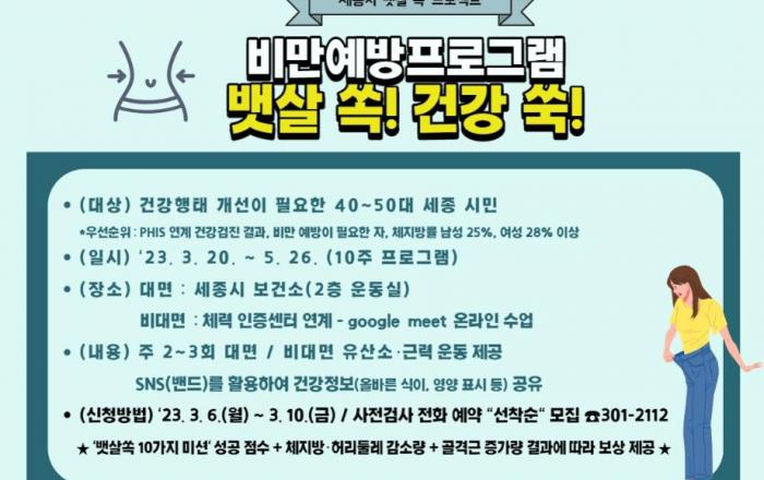 세종시보건소가 40∼50대 중년을 대상으로 비만 예방·관리를 위한 ‘뱃살 쏙! 건강 쑥!’ 프로그램을 운영한다. 이번 프로그램은 기초대사량 감소와 호르몬 변화에 따라 체중 증가 위험성이 높은 40∼50대 대상자를 중심으로 맞춤형 프로그램을 편성했다.
