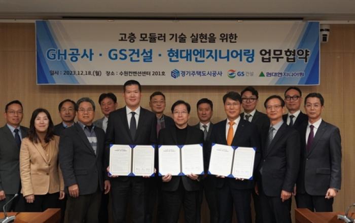 경기주택도시공사(GH)는 18일 경기도 수원 컨벤션센터에서 현대엔지니어링, GS건설과 고층 모듈러 기술 실현을 위한 상호협력 업무협약(MOU)을 체결했다고 밝혔다. '고층 모듈러 주택 선도적 수행에 따른 기술 공유와 협력'을 목적으로 추진된 이번 업무협약 체결식에는