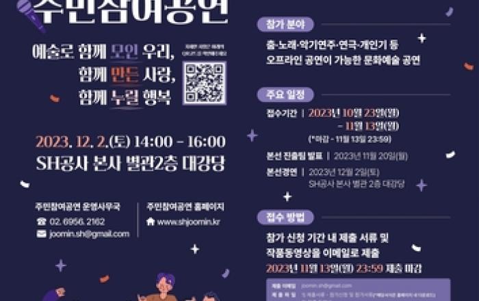 서울주택도시공사(SH공사)가 코로나19 엔데믹 이후 돌아온 일상의 기쁨을 함께 나눌 수 있는 공공주택 입주민과 지역주민 화합의 장을 마련한다. SH공사는 '2023년 주민참여공연'을 개최하고 11월 13일까지 작품을 접수받는다고 30일 밝혔다. 주민참여공연은 S