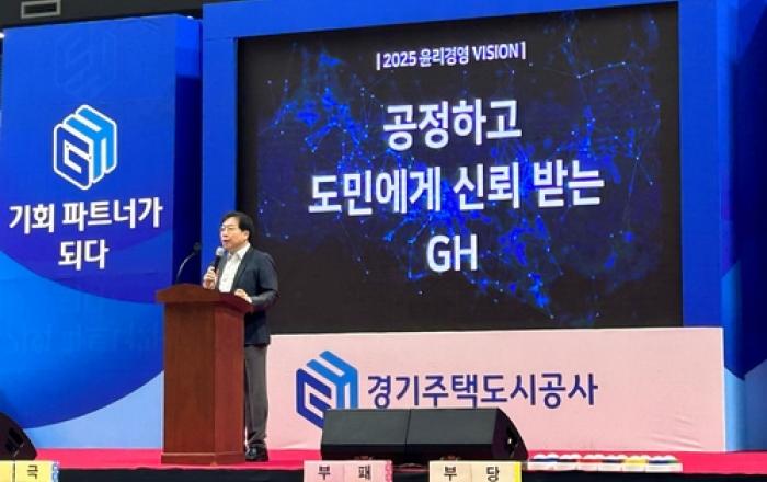 경기주택도시공사(GH)가 26일 서수원칠보체육관에서 'GH 윤리경영 비전 선포식'을 개최하고 새로운 윤리경영 비전을 발표했다. 새롭게 수립한 윤리경영 비전은 '공정하고 도민에게 신뢰받는 GH 청렴가치'로, GH는 이 비전을 바탕으로 2025년까지 ▲윤리경영 환경조성