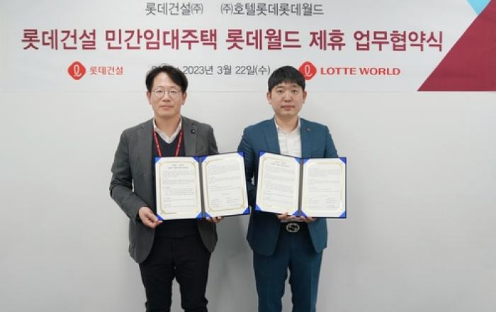 롯데건설이 지난 22일 서울 서초구 잠원동 본사에서 민간임대주택 주거 서비스 활성화를 위해 롯데월드와 제휴 업무협약(MOU)을 체결했다. 협약식에는 롯데건설 자산운영서비스팀 손승익 팀장과 롯데월드 마케팅1팀 김정환 팀장이 참석한 가운데 진행됐다. 이번 협약을 통