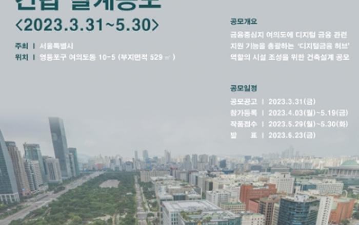 오세훈 시장이 밝힌 여의도 금융 허브 구축 사업의 첫걸음이 시작된다. 서울시는 ‘디지털금융지원센터’ 건립을 위해 3월 31일부터 5월 30일까지 61일간, 국내외 건축가들의 설계안을 공모한다고 밝혔다. 서울시는 2027년 3월 개관을 목표로 디지털금융지원