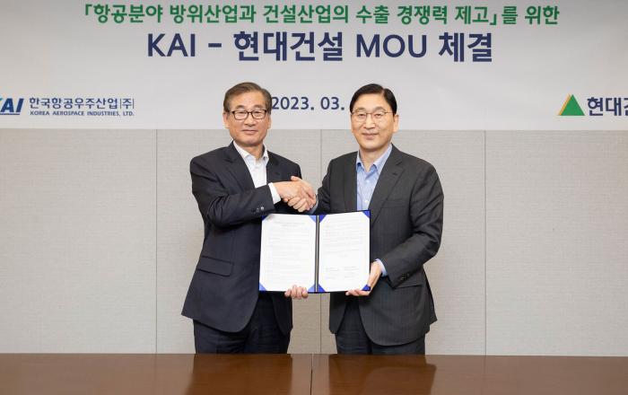 현대건설이 K-방산의 해외 시장 진출 확대에 적극 협력한다. 현대건설은 27일(월) 서울 종로구 계동에 위치한 현대건설 본사에서 한국항공우주산업(이하 KAI)과 ‘항공분야 방위산업과 건설산업의 수출 경쟁력 제고’를 위한 전략적 업무협약(MOU)을 체결했다