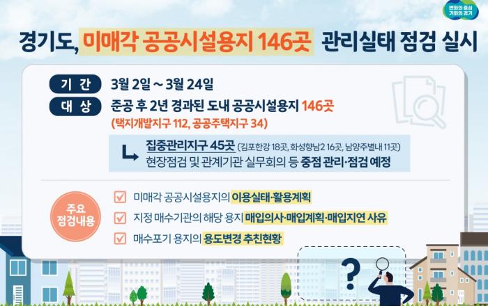 경기도가 준공 후 매각이 제대로 이뤄지지 않아 입주민들의 불편이 우려되는 택지개발·공공주택지구 내 미매각 공공시설 용지 146곳에 대한 관리실태 점검을 3월 2일부터 24일까지 실시한다. 27일 경기도에 따르면 준공 후 2년 경과된 도내 공공시설 용지는 19개