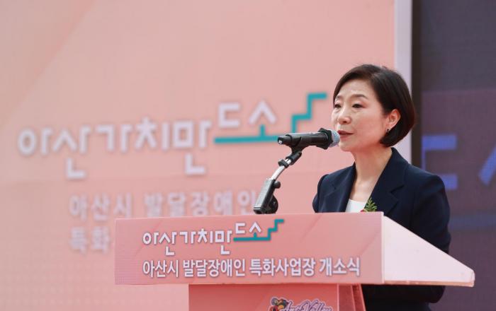 지역과 상생하는 발달장애인 가족의 창업·돌봄 공간인 ‘아산 가치만드소’가 본격 운영된다. 중소벤처기업부는 28일 충남 아산시에 전국에서 7번째 발달장애인 특화사업장인 ‘아산 가치만드소’를 개소했다고 밝혔다. 오영주 중소벤처기업부 장관이 28일 충남 아산에서 열린 ‘아산
