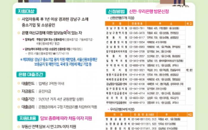 꿈이 모이는 도시, 미래를 그리는 서울 강남구가 고금리, 고물가, 고환율로 인한 경기침체로 어려움을 겪고 있는 중소기업과 소상공인을 위해 17일부터 신규대출에 대한 이자를 연 2∼2.5% 보전해준다. 이 사업은 업체당 최대 3억 원의 대출원금에 대한 금리를 구에서