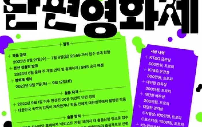 KT&G(사장 백복인)가 '제15회 대단한 단편영화제'의 출품작을 오는 7월 9일까지 공개 모집한다. 지난 2007년 시작된 대단한 단편영화제는 KT&G 상상마당이 국내 유수의 단편영화 발굴과 지원을 위해 시행하는 문화공헌 프로그램이다. 공모 대상작은 2022년