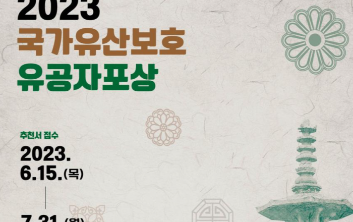 문화재청은 오는 15일부터 7월 31일까지 국가유산의 보존·연구·활용 분야에 뛰어난 공적을 세운 개인과 단체를 찾아 포상하기 위한 「2023년도 국가유산보호 유공자 포상」후보자 추천서를 접수한다. 「국가유산보호 유공자 포상」은 국가유산의 중요성을 널리