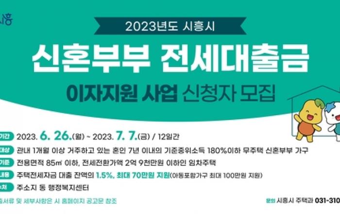 시흥시는 1일부터 신혼부부 가구를 대상으로 하는 '2023 신혼부부 전세대출금 이자지원 사업'을 시행한다. '신혼부부 전세대출금 이자지원 사업'은 혼인 7년 이내 신혼부부 가구의 주거비 부담을 완화하고 안정된 정주여건을 조성하고자 마련됐다. 주택전세자금 대출 잔