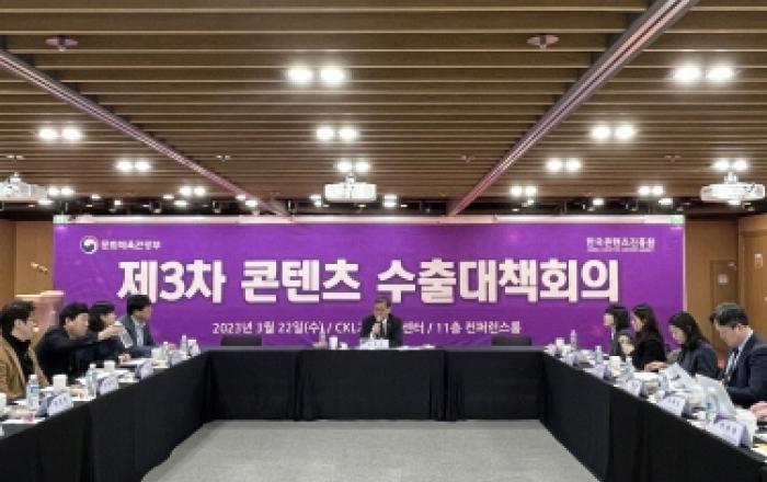 문화체육관광부(이하 문체부)는 3월 22일, 한국콘텐츠진흥원(이하 콘진원) 광화문분원에서 전병극 제1차관 주재로 '제3차 콘텐츠 수출대책회의'를 개최했다. 문체부는 지난 2월 23일, 대통령 주재로 열린 '제4차 수출전략회의'에서 'K-콘텐츠 수출전략'을 발표하고