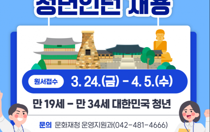 문화재청은 다양한 문화유산 행정 경험 기회를 제공하여 청년들의 국정참여 기회를 확대하고자 2023년도 청년인턴 20명을 3월 24일부터 4월 5일까지 공개 모집한다. 이번 청년인턴 채용은 지난해 10월 국무회의에서 청년들의 국정참여 기회를 확대