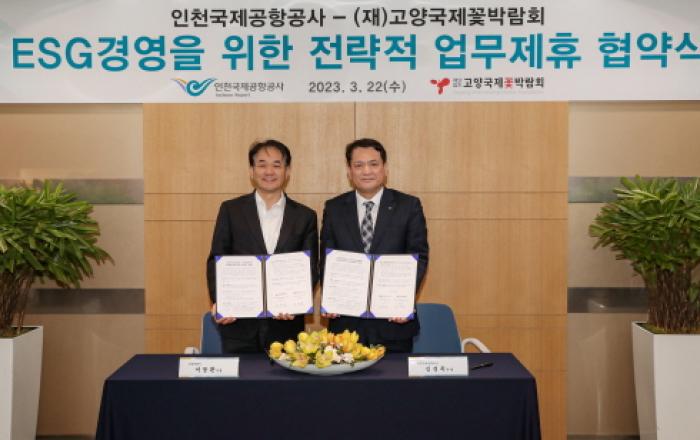 인천국제공항공사는 22일 오전 공사에서 재단법인 고양국제꽃박람회와 자원의 선순환과 전시, 관광 분야 협업을 주요 내용으로 한 'ESG경영을 위한 전략적 업무제휴 협약'을 체결했다고 밝혔다. 두 기관은 ▲고양국제꽃박람회 종료 후 전시물 새활용 ▲공항 내 박람회 홍보장