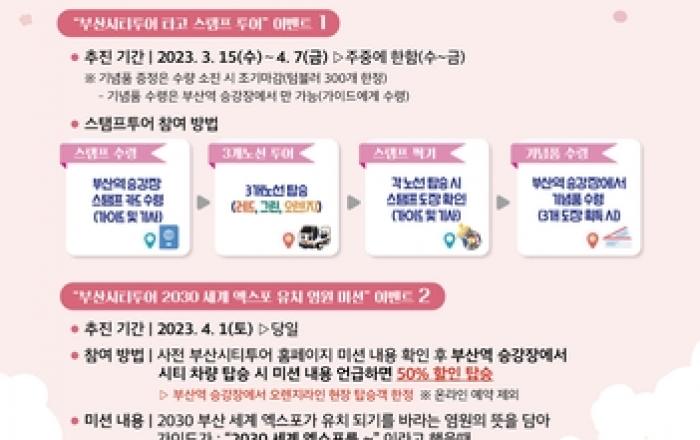 부산관광공사(이하 '공사')는 부산 '2030 부산엑스포 유치' 염원 확산과 시티투어 즐길 거리 확대를 위해 [부산시티투어 봄맞이 이벤트]를 진행한다고 15일 밝혔다. 부산을 방문하는 관광객을 대상으로 부산 감성 이벤트 「부산시티투어 타고 스탬프 투어」와 '2030