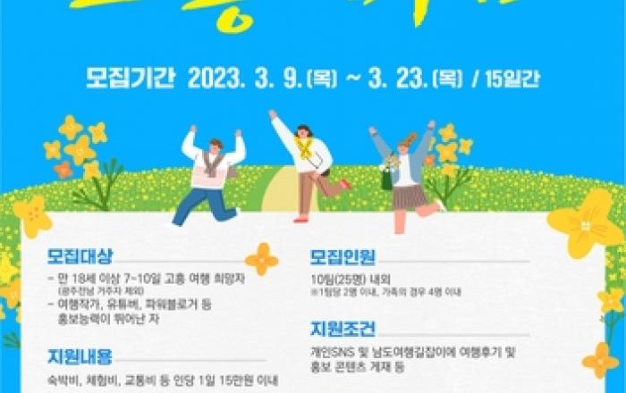 고흥군은 체류여행 프로젝트인 2023 남도에서 한 달 여행하기 '고흥에 머뭄' 참가자를 모집한다고 밝혔다. '고흥에 머뭄' 프로젝트는 체류 여행 희망자를 대상으로 여행경비를 일정 부분 지원해, 해당 여행객이 고흥 곳곳의 매력을 직접 체험하며, 개인 SNS 등 온라인