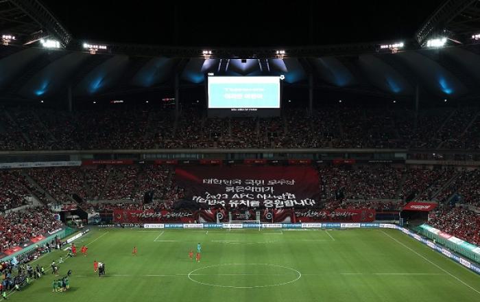 지난 27일 대한민국 대 카메룬의 축구 평가전이 열린 서울월드컵경기장에 “대한민국 국민 모두와 붉은악마가 2023 아시안컵 대한민국 유치를 응원합니다”라고 적힌 붉은색의 대형 통천이 관중석 전면에 띄워졌다. 축구응원단 붉은악마가 63년 만의 ‘20