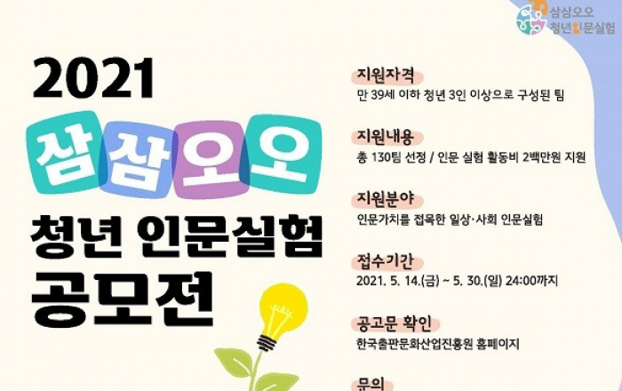 정부는 청년들이 개인의 문제부터 사회적 문제까지 상상력을 더해 인문의 관점에서 탐구할 수 있는 실험활동을 지원한다.문화체육관광부는 14일 한국출판문화산업진흥원(이하 출판진흥원)과 함께 이날부터 30일까지 ‘삼삼오오 청년 인문실험(이하 청년 인문실험)’에 참여할 130개