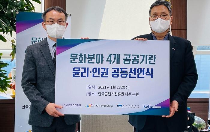 한국콘텐츠진흥원(이하 콘진원)은 문화분야 공공기관인 아시아문화원, 영화진흥위원회, 한국문화예술위원회와 뜻을 모아 윤리·인권 공동선언문을 선포하고, 지난 27일 윤리·인권 공동선언식을 가졌다.◆ 공공기관으로서 사회적가치 창출 앞장…윤리·인권가치 확산 위한 공감대 형성이번