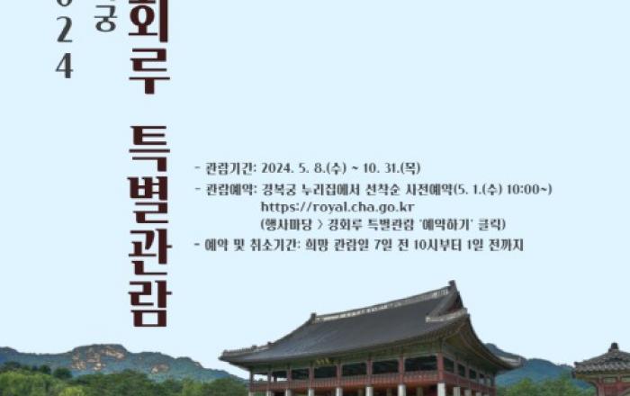 문화재청 궁능유적본부 경복궁관리소는 오는 5월 8일부터 10월 31일까지(혹서기 7월 제외) 5개월간 매일 4회씩(오전 10시, 오전 11시, 오후 2시, 오후 4시) 경복궁 ‘경회루 특별관람’을 운영한다. 경복궁 경회루(국보)는 연못 안에 조성된