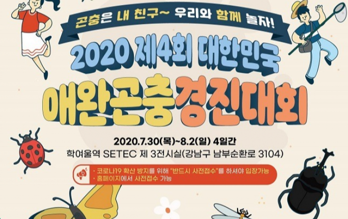 서울특별시와 농촌진흥청은 「2020 제4회 대한민국 애완곤충경진대회」를 7월 30일(목)부터 8월 2일(일)까지 총 4일 간 세텍(SETEC, 3호선 학여울역)에서 공동으로 개최한다고 밝혔다.대한민국 애완곤충경진대회는 국내 애완곤충산업 활성화와 외연 확장을 위한 국민