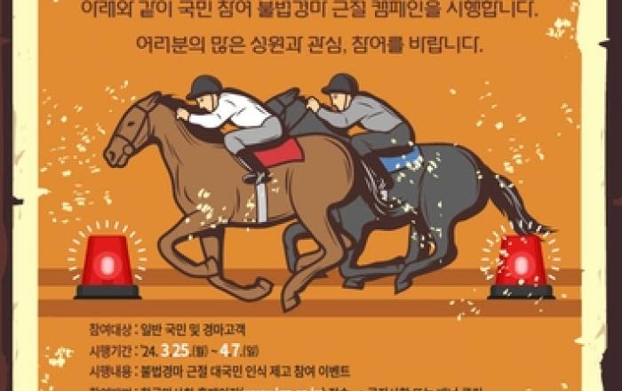 한국마사회는 오는 3월 25일부터 4월 7일까지 2주간 건전한 경마문화 조성과 불법경마 근절을 위해 '국민참여 불법경마 근절 캠페인'을 전개한다고 밝혔다. 동 캠페인은 최근 불법도박이 사회적 이슈로 떠오르고 있는 가운데 불법경마의 폐해를 알리고 경각심을 고취시키고자