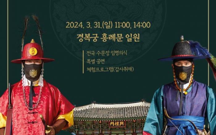 문화재청 궁능유적본부는 한국문화재재단과 오는 31일 오전 11시와 오후 2시 두 차례에 걸쳐 경복궁 흥례문 일원에서 전국의 수문장들에게 임명장을 수여하는 ‘국왕께서 친히 전국의 수문장을 낙점하다!’ 행사를 개최한다. ‘전국 수문장 임명의식’은
