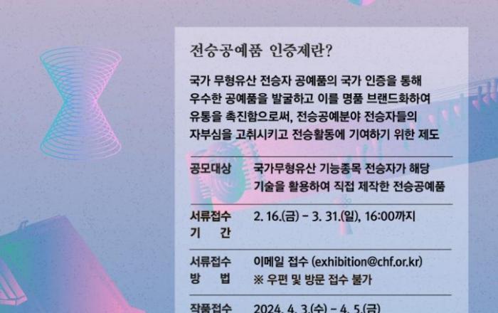 문화재청 국립무형유산원은 한국문화재재단과 3월 31일까지 ‘2024년 전승공예품 인증제’ 공모를 실시한다. ‘전승공예품 인증제’란 「무형문화재 보전 및 진흥에 관한 법률」제41조에 따라 2016년부터 시행하고 있는 제도로, 국가무형유산 전승 기