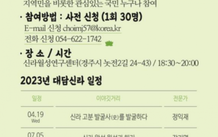 문화재청 국립문화재연구원 국립경주문화재연구소는 올해 네 차례 기획된「시민들과 마주 앉아 나누는 신라 이야기, 대담신라(對談新羅)」의 마지막 일정을 장식하는 ‘고려·조선시대 사람들이 바라본 신라 고적’을 오는 12월 6일 오후 6시 30분, 신라월성연구센터(숭문대)에서