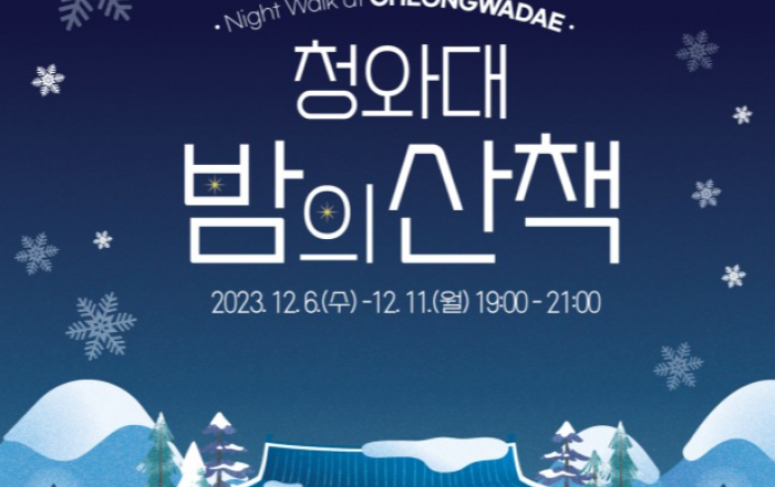 문화체육관광부는 한국문화재재단과 함께 다음 달 6일부터 11일까지 ‘청와대 밤의 산책’ 동절기 행사를 개최한다고 28일 밝혔다. 행사 기간 중 날마다 오후 7시부터 오후 9시까지 운영하며 하루 최대 2000명까지 참여할 수 있다. ‘청와대 밤의 산책’은 지난