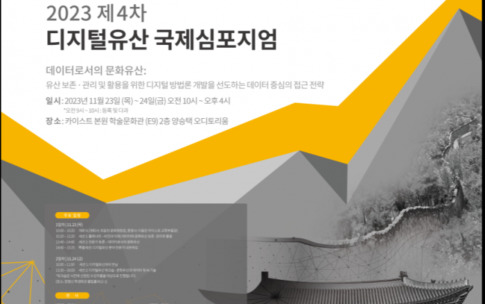 문화재청은 한국과학기술원, 이코모스 한국위원회와 함께 11월 23일부터 24일까지 한국과학기술원(이하 ‘카이스트’) 학술정보관(대전 유성구)에서 ‘데이터로서의 유산: 보존관리 및 활용을 위한 데이터 중심의 전략(Data-driven heritage conservatio